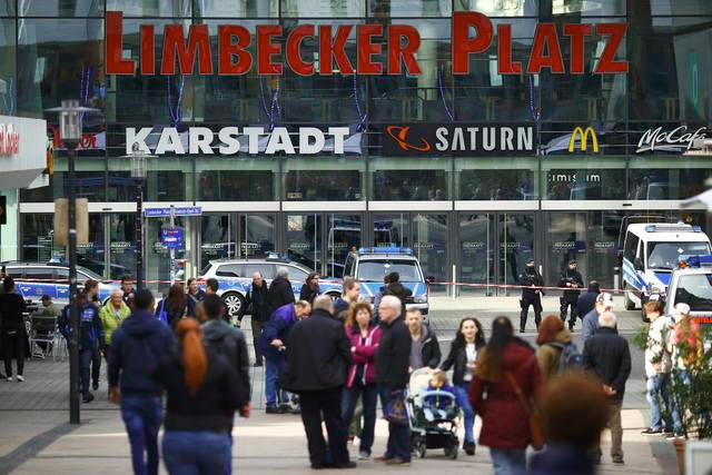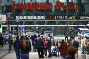 Police at the entrance of Limbecker Platz shopping mall in Essen,