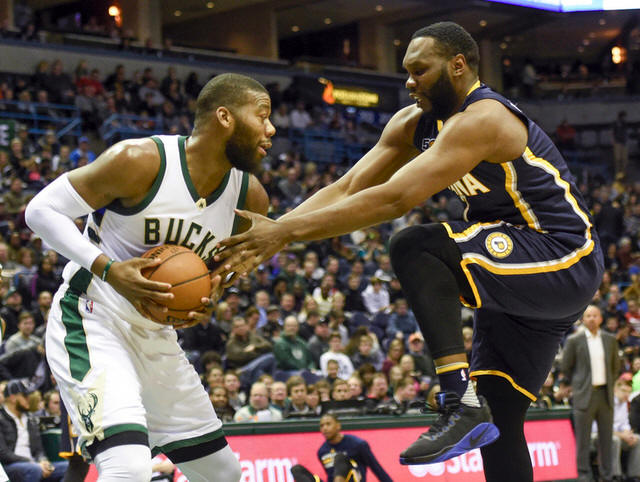 Bucks center Greg Monroe (15) steals the ball from Indiana Pacers