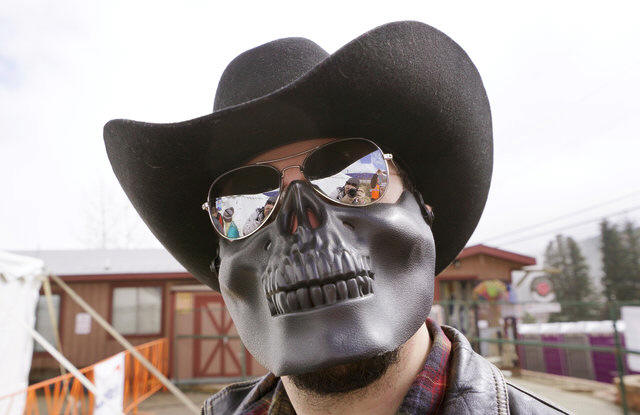 A man poses in a skeleton mask at the annual "Frozen Dead Guy