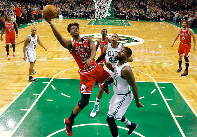 Bulls forward Jimmy Butler (21) goes to the basket past Boston