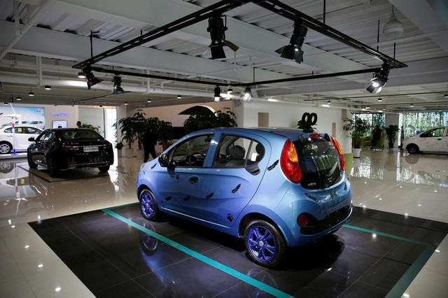 Automobiles are displayed at a electric car dealership in Shanghai,