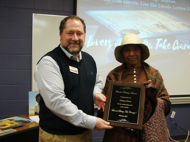 Harriet Tubman, aka Kathryn Harris, accepts a plaque from Lincoln Heritage Museum Director Tom McLaughlin on Friday evening. As part of the "Lovers of Liberty, Take Courage" exhibit at the museum, Harris gave a talk portraying Tubman, a strong black woman who was dedicated to rescuing slaves through the underground railroad.