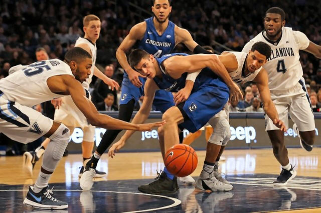 ball in front of Creighton Bluejays forward Martin Krampelj (15) and