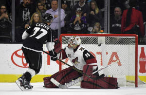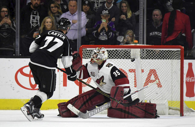Kings center Jeff Carter (77) shoots the puck past Arizona Coyotes