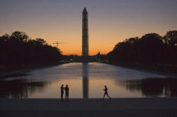 A couple (L) and a jogger pass by the Lincoln Memorial Reflecting