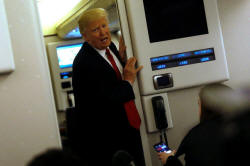 U.S. President Donald Trump speaks to reporters aboard Air Force One
