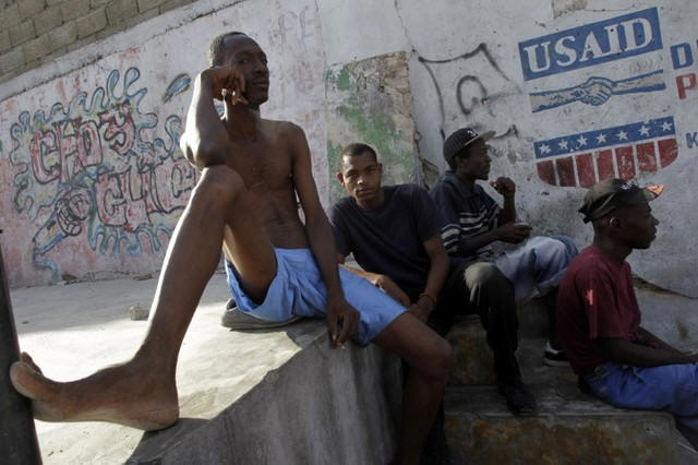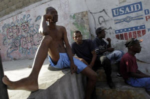 Haitians sit in a street next to a logo of USAID (United States