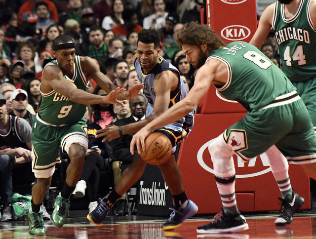Bulls guard Rajon Rondo (9) center Robin Lopez (8) and Memphis