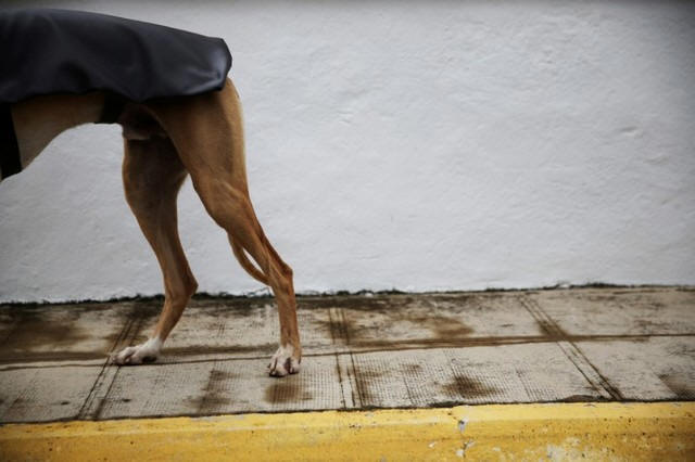Menni stretch out across floor mats and stroke greyhound puppies Atila