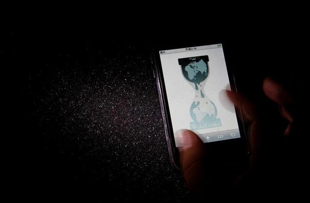 The logo of the Wikileaks website is pictured on a smartphone in