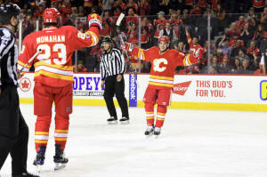 Flames center Sean Monahan (23) celebrates his first period goal