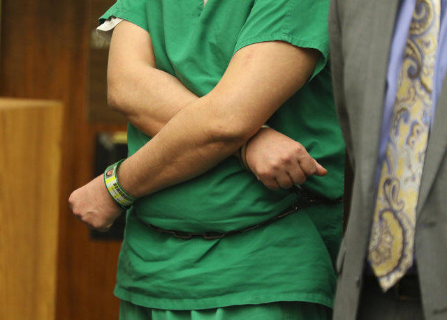 Guerrero, dressed in green jail garb and shackled at the wrists,