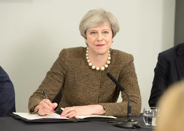 Britain's Prime Minister Theresa May signs a Swansea City deal