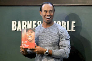 Golfer Tiger Woods poses with a copy of his new book "The 1997 Masters: My Story" at a book signing event at a Barnes & Noble store in New York City, New York, U.S., March 20, 2017. REUTERS/Mike Segar
