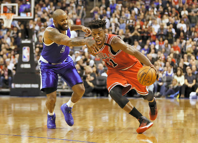 Bulls forward Jimmy Butler (21) gets past Toronto Raptors