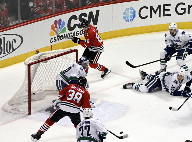 Ryan Hartman (38) shoots and scores a goal against the Vancouver