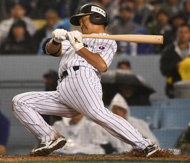 Japan outfielder Norichika Aoki (7) reacts to an inside pitch