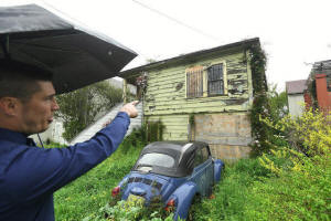 Emeryville Vice-Mayor John Bauters gestures to a neglected property