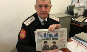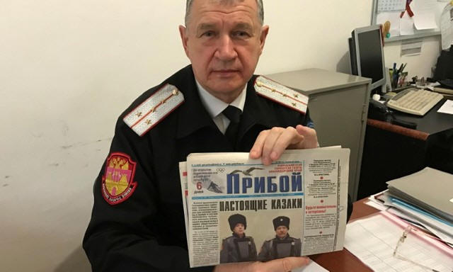 Russian Cossack commander Vladimir Bagliy shows a local newspaper
