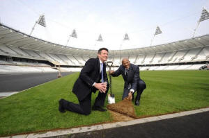 Chairman of London 2012 Sebastian Coe (L) poses for the media with