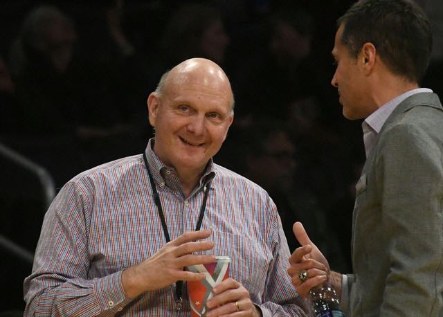 LA Clippers owner Steve Ballmer talks with Los Angeles Lakers