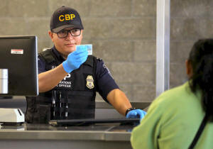 A U.S. Customs and Border Patrol officer interviews people entering