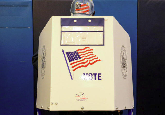 A man, wearing a hat with an embroidery of the U.S. flag, votes on