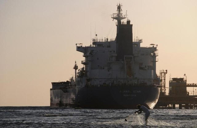 A fisherman pulls in his net as an oil tanker is seen at the port in