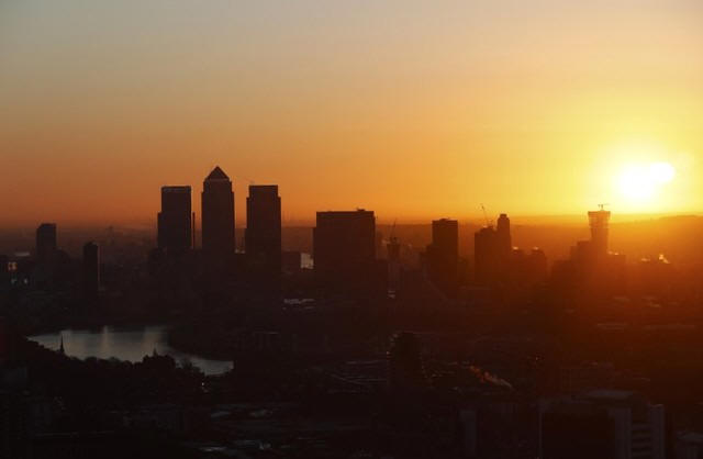 Canary Wharf is seen at sunrise from the Sky Garden of 20 Fenchurch