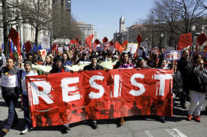 carrying signs with slogans such as “We Fight Back" and "Keep