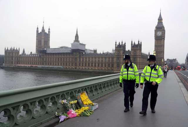 Flowers are placed at the scene of an attack on Westminster Bridge,