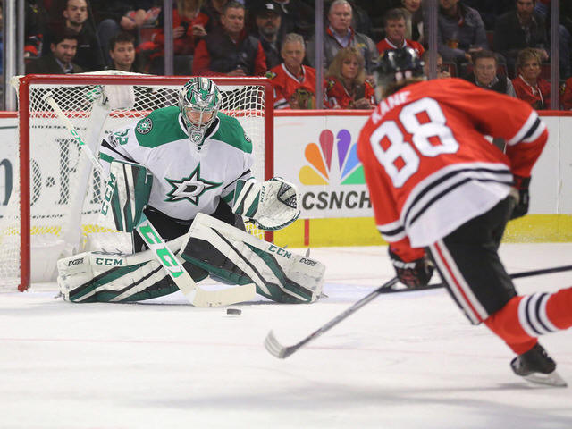 Blackhawks right wing Patrick Kane (88) scores a goal past Dallas