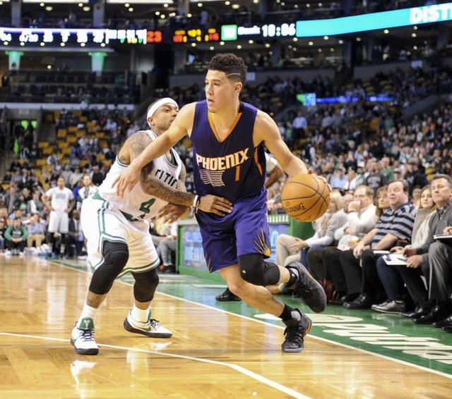 Phoenix Suns guard Devin Booker (1) controls the ball while Boston Celtics guard Isaiah Thomas (4) defends during the second half at TD Garden. Mandatory Credit: Bob DeChiara-USA TODAY Sports |