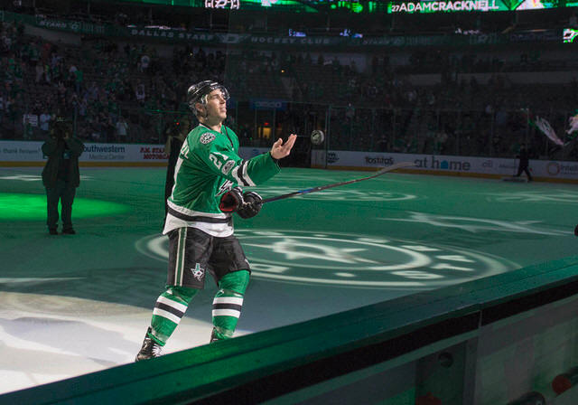 Stars right wing Adam Cracknell (27) throws a puck to the crowd