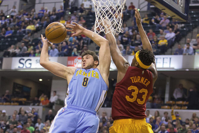 Nuggets forward Danilo Gallinari (8) rebounds the ball over Indiana