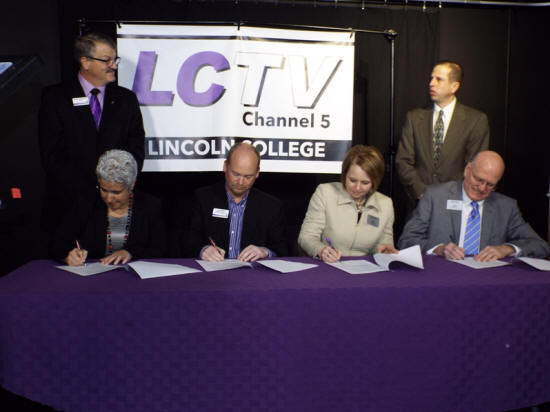 [March 25, 2017]  LINCOLN - On Thursday morning, three representatives from Lake Land College in Mattoon traveled to Lincoln College for a signing ceremony creating a transfer program between the two colleges in field of communications/broadcasting.