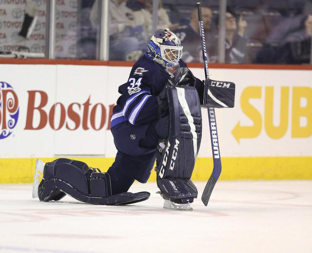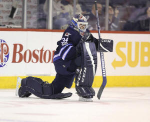 Jets goalie Michael Hutchinson (34) stretches prior to the game