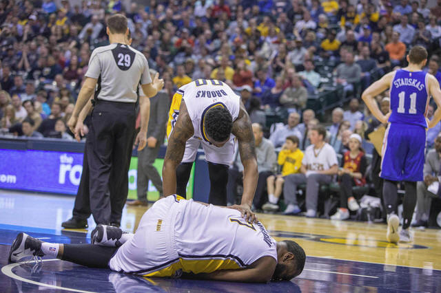 Pacers center Al Jefferson (7) is injured and lays on the floor