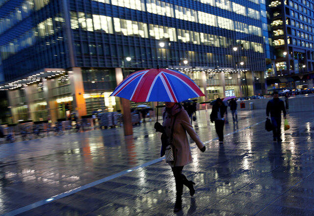 Workers walk in the rain at the Canary Wharf business district in