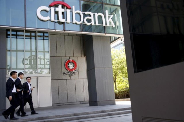 People walk past a branch of Citibank in Beijing, China, April 18,