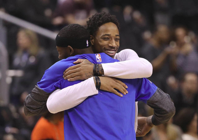 Raptors guard DeMar DeRozan (10) greets former teammate Orlando
