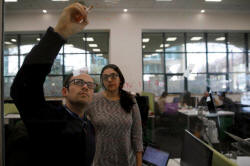An employee writes notes on a glass panel at the offices of Freightos, an online marketplace for international shipping, with investors including Sadara Ventures, a venture capital fund targeting the Palestinian high-tech sector, in Jerusalem March 27, 2017. Picture taken March 27, 2017. REUTERS/Amir Cohen |
