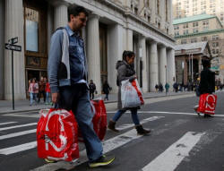 People cross Broadway with shopping bags in Manhattan, New York