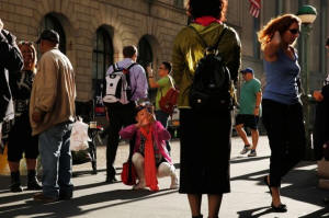 A woman crouches down to take a cell phone photograph as pedestrians
