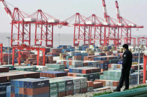 A man watches containers at the Yangshan deepwater port in Shanghai