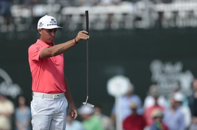 Rickie Fowler lines up his putt on the 18th hole during the first