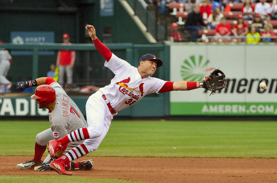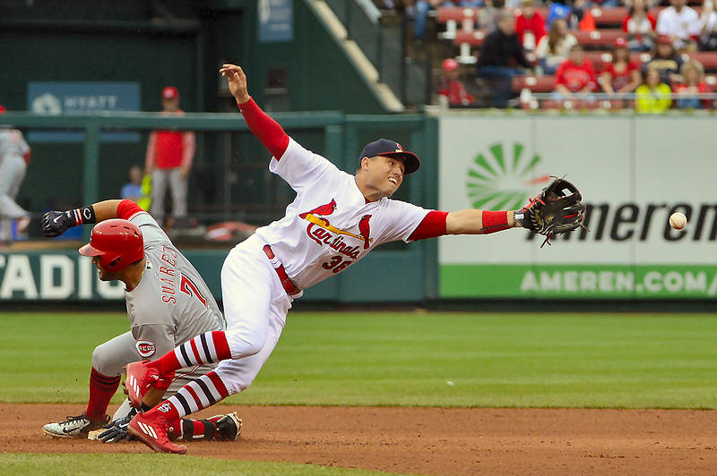 slides in to second during the seventh inning at Busch