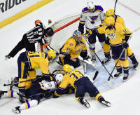 Predators goalie Pekka Rinne (35) makes a save in traffic during
