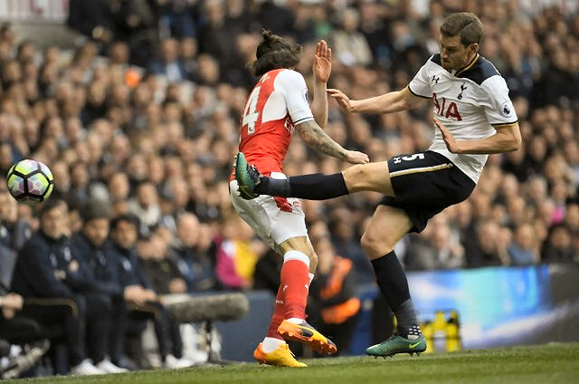 Arsenal's Hector Bellerin in action with Tottenham's Jan