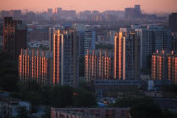 Property buildings are seen against the dawn sky in Beijing, China,